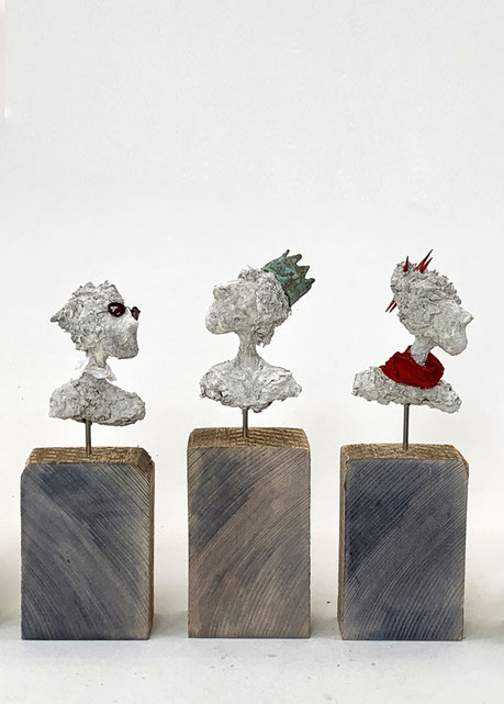 Durch beizen, schleifen und versigeln entsteht ein harmonischer Kontrast zwischen der monochromen, zurückhaltender Optik der hellen Büsten und dem rauhen Flair der Sockel.